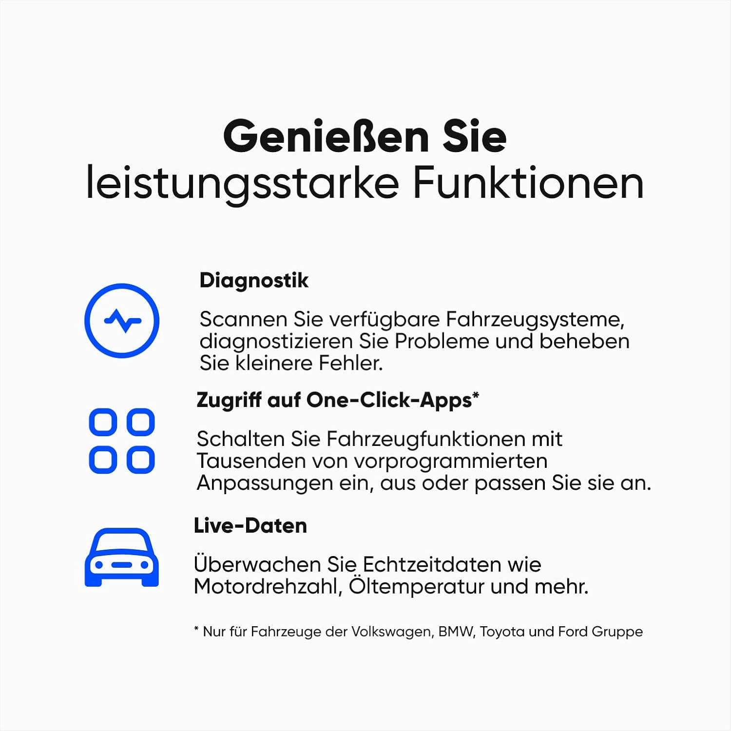 ***One-Click-Apps sind eine von OBDeleven entwickelte Funktion, die offiziell keine Herstellergenehmigung erfordert (Diagnose, Reparaturanleitungen und Fehlermeldungen). Daher unterliegen sie nicht den Lizenzvereinbarungen mit den Herstellern.