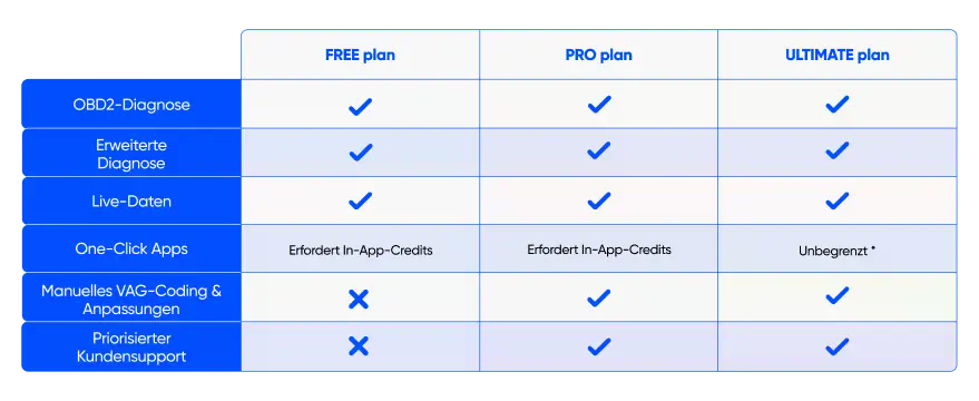 OBDeleven wird gemeinsam mit Fahrzeugherstellern und deren technischen Teams entwickelt, um die bestmögliche Leistung zu erzielen. Aufgrund unterschiedlicher Lizenzrichtlinien für Diagnosen können die verfügbaren Funktionen je nach Marke und Region variieren.