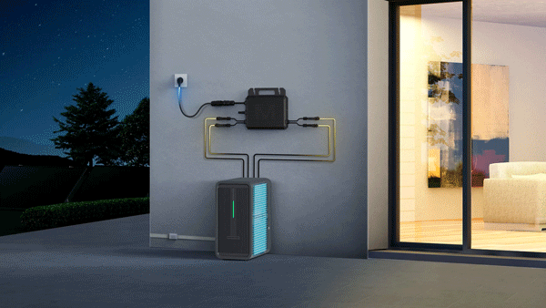Nachts: Der im B2500-D gespeicherte Strom wird über den Mikro-Wechselrichter in das Netz eingespeist und versorgt auf intelligente Weise die Verbraucher im Haushalt. Mit einer Batteriekapazität von 2,24 kWh (flexibel erweiterbar) kann der B2500-D den Strombedarf von Geräten wie Routern, Kühlschränken, Ventilatoren und mehr einfach decken.